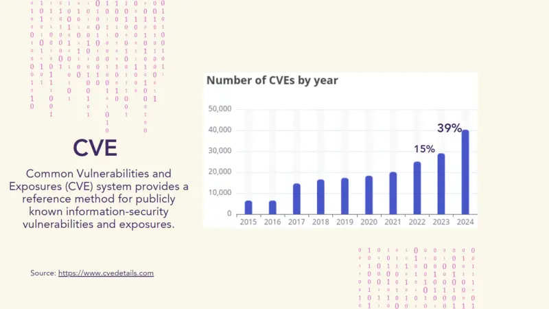 A CVE stands for “Common Vulnerabilities and Exposures”. These are bugs in the code or configuration of software that allow an attacker to gain indirect access to systems and networks. For example, a vulnerability in a web server allows remote code execution. In 2024, the most frequent types of computer attacks were cross-site scripting (XSS) and SQL injections, as a result of these CVEs.